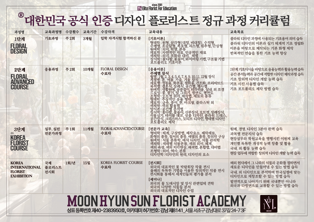 디자인 플로리스트 정규과정은 대한민국이 공식 인증한 단 하나의 정규 교육과정입니다.