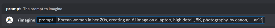 Ex) imagine/[생성할 이미지 설명], high detail, 8K, photography, by canon, -- ar 1:1