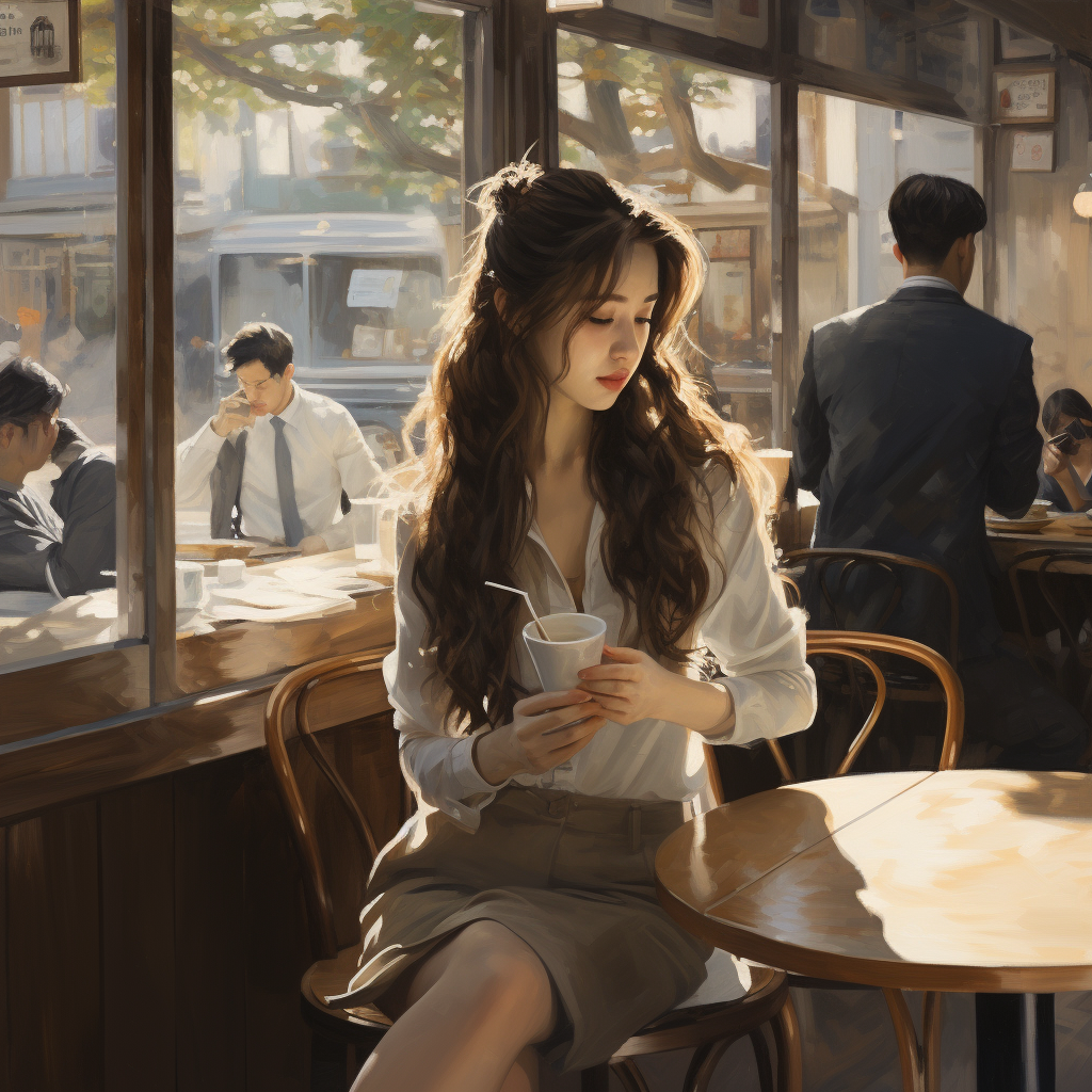 한국인 20살 여자, 낮 12시, 카페에서, 커피를 마심, 남자친구를 만나서, 우아하게